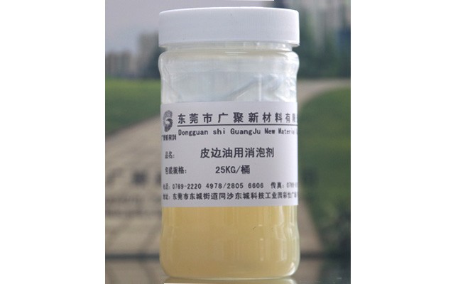 一、产品名称:皮边油用消泡剂二、使用范围:印花浆,胶粘剂,皮革等。100%含量,破泡快,消泡效益高,不消光。三、成分及应用:由矿物油、白炭黑、特种增效剂和分散剂组成,(不含有机硅),可广泛用于个各水性涂料、胶粘剂、印花胶浆制备…的消泡,消泡效果优异。四、技术指标:外观: 黄色至浅棕色半透明油状液体含量: 100%稳定性(2000转/20分钟): 不分层、无沉淀(允许长时间放置分层)PH: 5.0-
